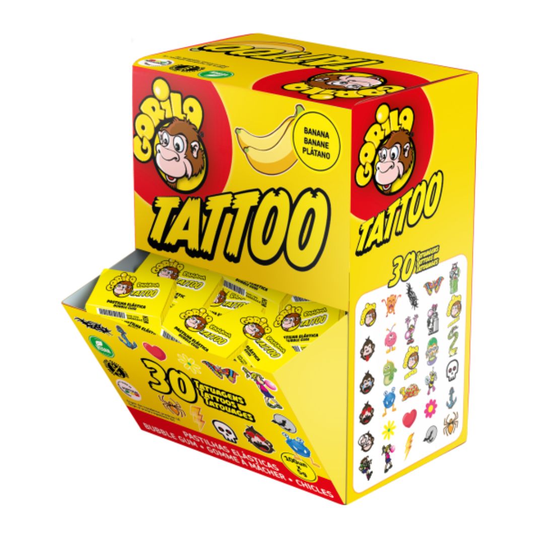 Gorila Banana with a tattoo, a classic bubble gum famous for its sweet flavour and the temporary tattoo that comes with it.
