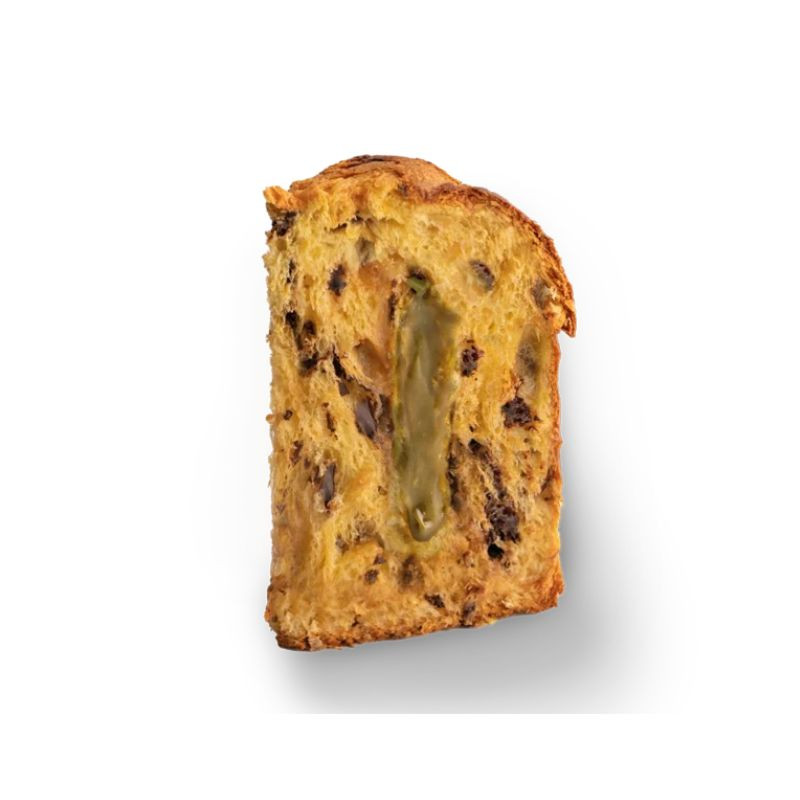 Delicious dark chocolate chips are dipped into the soft dough that has risen for 72 hours and meet the rich cream made by hand by our pastry chefs using slightly salted Bronte PDO green pistachio.