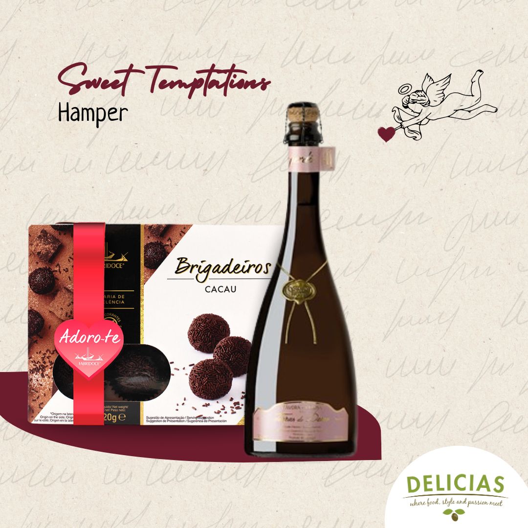 This hamper includes a bottle of Terras do Demo Rosé Sparkling Wine (75cl), fresh and vibrant, ideal for toasting to unforgettable moments. It is paired with rich and irresistible Chocolate Brigadeiros by Fabridoce, offering a smooth, decadent taste that melts in the mouth.