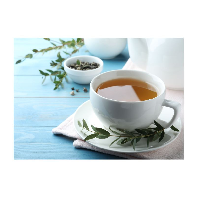 Chá de infusão de ervas com eucalipto, que alivia as irritações da garganta.