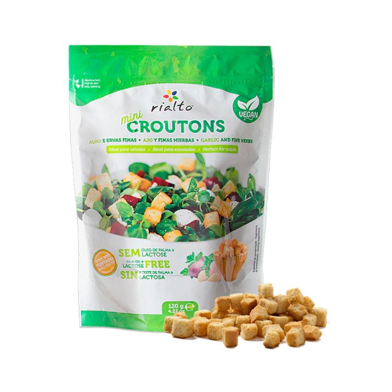 CompareNovo produto desenvolvido em novo formato! Com fácil abertura e fecho. Mini Croutons aromatizados com alho e ervas finas VEGANO! Uma opção mais saudável de molho para salada, sem qualquer processo de fritura, lactose e óleo de palma, são igualmente saborosos para trazer às suas saladas preferidas, ótimo sabor e textura. Um excelente produto adaptado para os consumidores Vegan que gostam de adicionar especiarias às suas refeições/saladas.