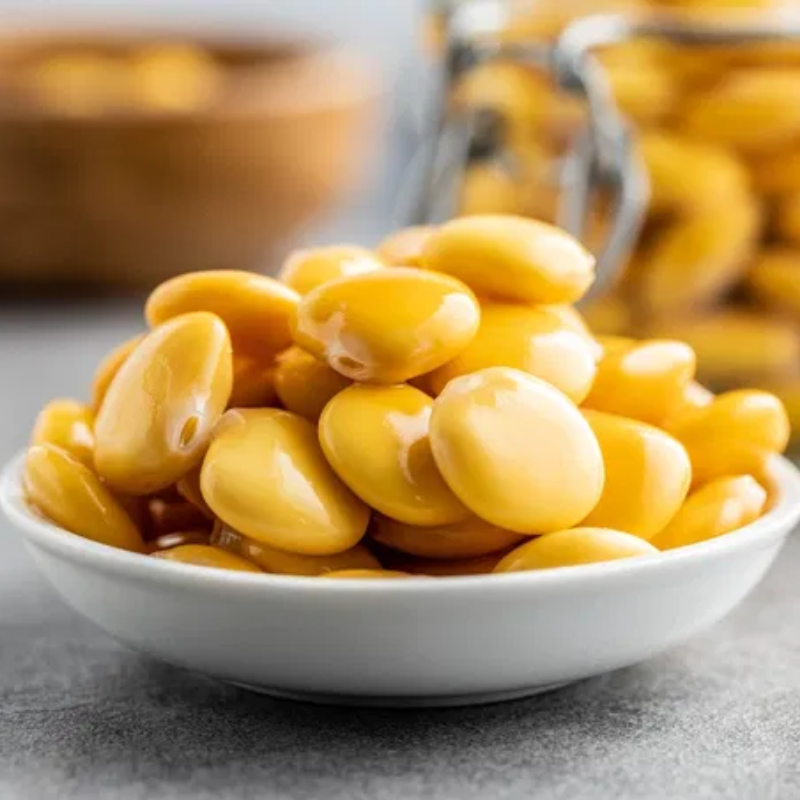 Leguminosa de género Lupinus, proveniente do Chile, cozida e conservada em salmoura composta por água, sal,regulador de acidez e conservante.