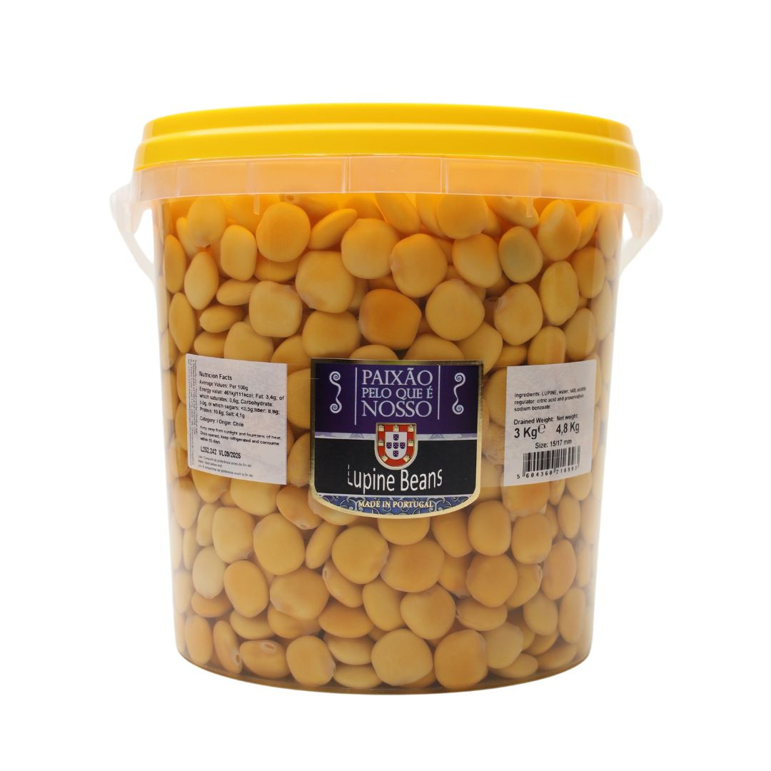 Leguminosa de género Lupinus, proveniente do Chile, cozida e conservada em salmoura composta por água, sal,regulador de acidez e conservante.
